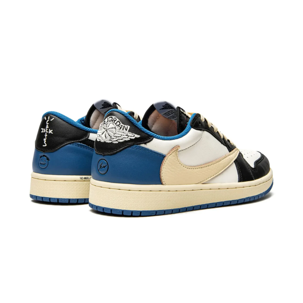 The Air Jordan 1 Low Travis Scott x Fragment Design is a highly coveted sneaker collaboration that fuses streetwear and heritage basketball style. Featuring premium leather in a mix of white, royal blue, and black, it sports Travis Scott’s signature reverse Swoosh on the lateral side. Fragment’s lightning bolt logo and Cactus Jack branding add exclusive flair. With its limited release and bold aesthetics, it’s a standout piece for collectors and sneakerheads alike.