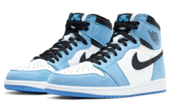 The “University Blue” features a crisp white leather base with iconic pastel blue overlays—reflecting Michael Jordan’s University of North Carolina roots—complemented by bold black Swoosh, collar, and laces